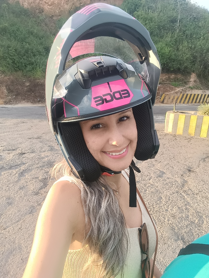 A woman wearing a motorcycle helmet is smiling at the camera. The helmet is gray with pink accents and the word "EDGE" in reverse on the forehead. She has light hair and a tan complexion. Her outfit consists of a light-colored tank top. Sunglasses are clipped to the front of the tank. The background includes a road, vegetation, and a barrier with yellow and black stripes. The lighting appears to be from the late afternoon or early morning sun.