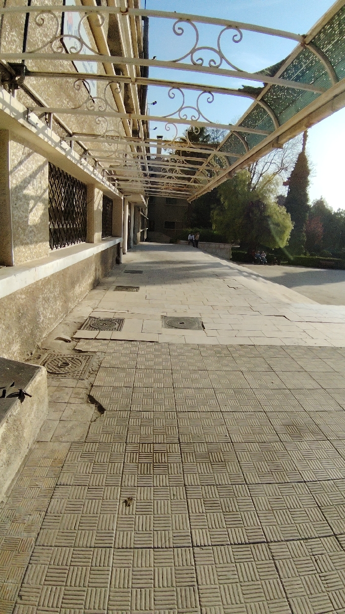 A building's exterior features a white, wrought-iron canopy extending along a walkway. The structure's facade displays gridded windows. The walkway is paved with tan, square tiles. A small step leads to a higher level with larger, rectangular tiles and several manhole covers. In the background, trees and a couple of figures can be seen. The scene is bathed in sunlight, casting shadows along the walkway.