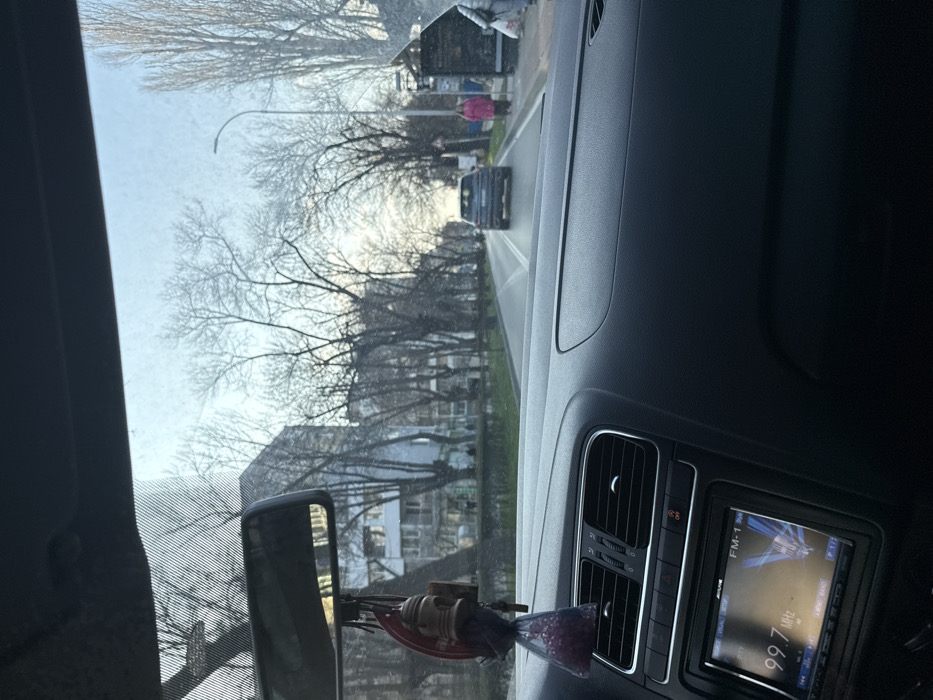 The image depicts a daytime urban street scene in Varna, Bulgaria, viewed from the interior of a vehicle. The foreground features the vehicle's dark-colored dashboard, which includes air vents, a hazard light button, and an Alpine-branded infotainment system displaying "FM-1" and "99.7 MHz." A rearview mirror is suspended from the windshield, with a decorative object consisting of a wooden element, a red disk, and a purple mesh bag containing granular material hanging from it. The windshield is partially obscured by streaks or dirt. The primary subject is a two-lane asphalt road extending into the distance, separated by a solid white line. The road surface appears damp or reflective. A dark-colored SUV is observed driving away from the viewer in the far lane. On the right side of the road, a sidewalk is visible, alongside a bus stop structure with a dark back panel and a lighter roof. Two individuals are present on the sidewalk near the bus stop; one person is dressed in a bright pink coat and dark lower garments, while another, partially visible figure, holds a white item or bag. A street light pole and a small triangular road sign are also on the right. On the left side of the road, a row of bare deciduous trees lines the street, behind which are multi-story residential or commercial buildings with light-colored facades. The background shows more buildings and trees, all under a light blue sky, indicating daylight. The bare trees suggest the season is late autumn, winter, or early spring. The scene represents a typical urban thoroughfare within Varna, Bulgaria.