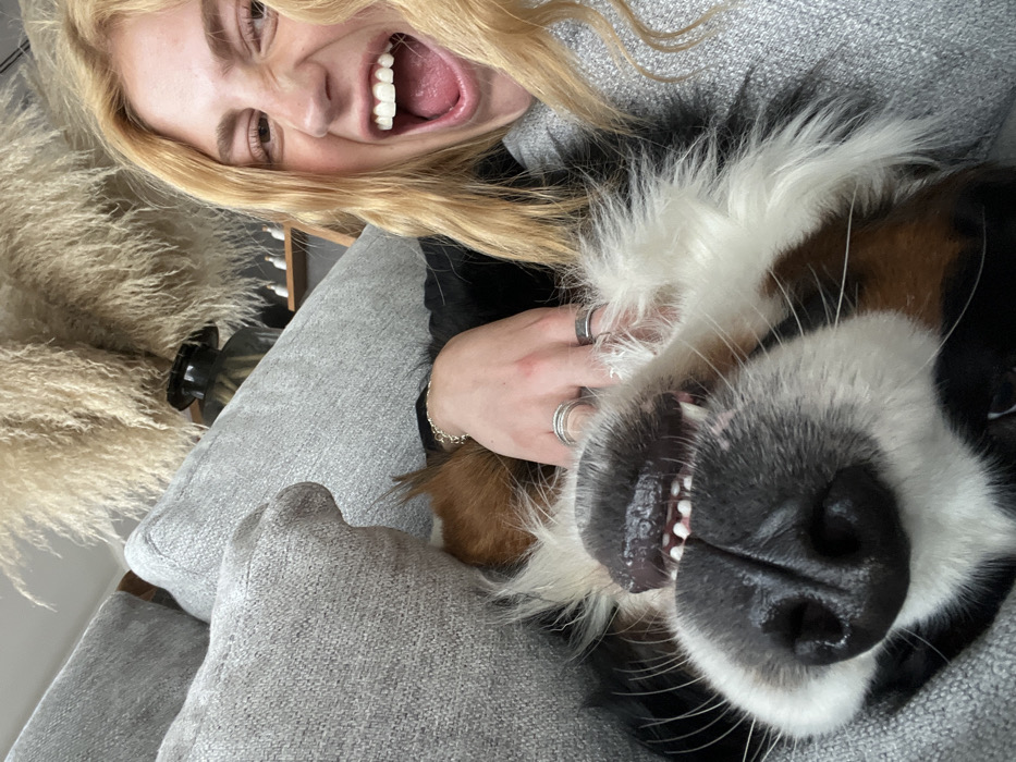 A woman with blonde hair and a gray sweater is smiling widely with her mouth open, revealing her teeth. She is lying on a gray couch with a Bernese Mountain Dog, whose snout and teeth are prominently displayed in the foreground. The woman is holding the dog with her hand, which has multiple rings and a bracelet on it. Behind them is a vase with fluffy tan plants.
