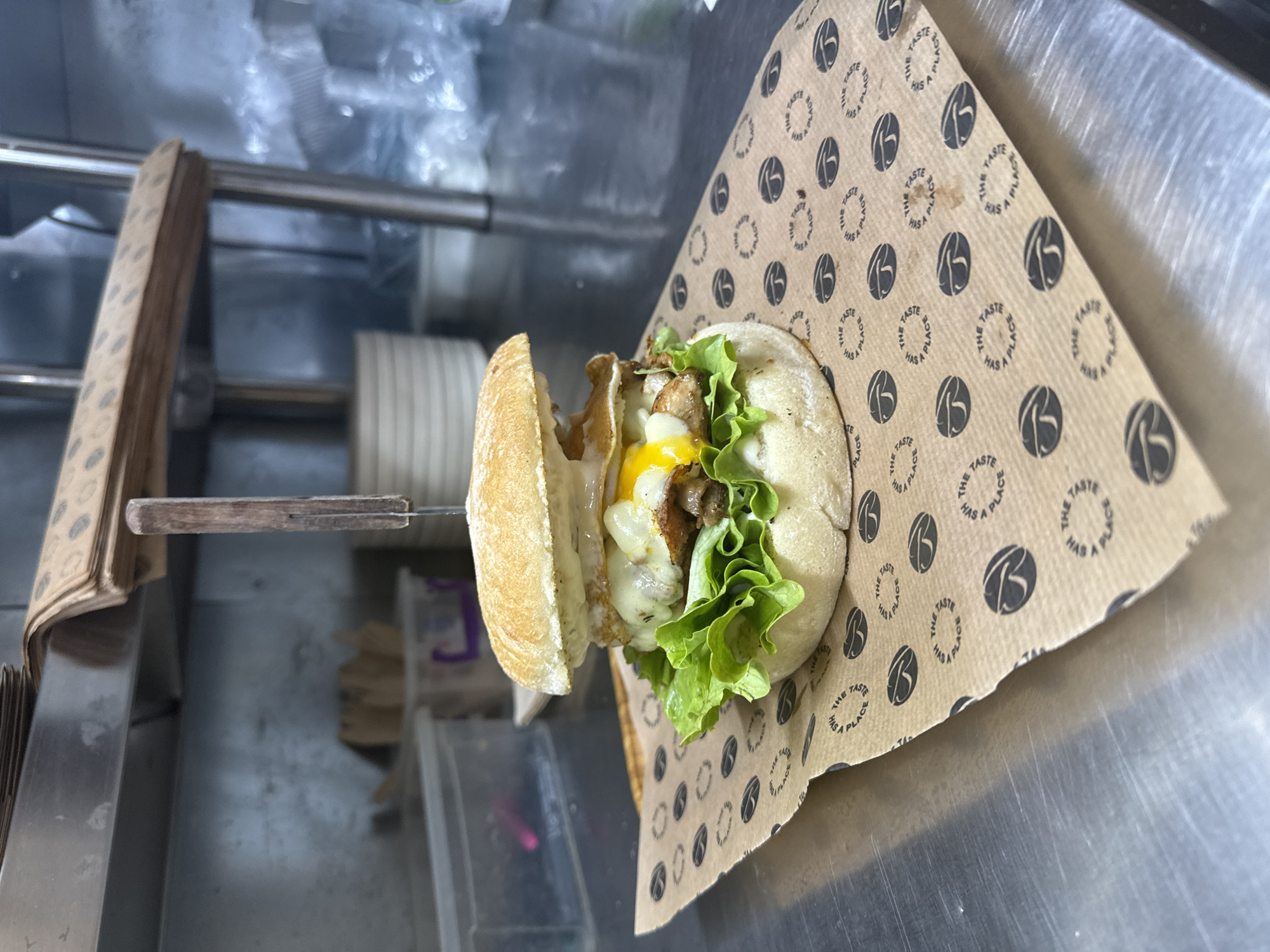 Here is a detailed description of the image: **Scene:** An outdoor food preparation area, likely a food truck, with a focus on a single gourmet burger. **Subject:** The burger, presented on a square sheet of food-grade paper branded with circular text and logo "The Taste Has a Place". It consists of a lightly toasted bun, lettuce, melted cheese, a fried egg, and some sort of meat (possibly chicken or pork). A skewer pierces the burger to hold it together. The burger is situated in front of a stainless steel countertop. **Objects:** The food-grade paper sheet, metal skewer, stainless steel countertop, the burger, its various components such as lettuce, cheese, egg, meat, and the bun. A stack of similarly branded food-grade paper sheets are held vertically in a dispenser adjacent to the burger. **Environment:** The location is likely a food truck or temporary outdoor food service. The presence of stainless steel suggests hygiene is important.