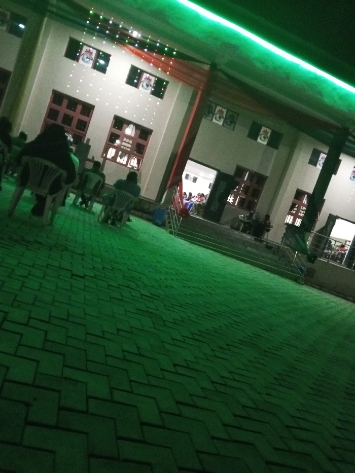 A building stands adorned with flags and strings of lights, with people sitting outside. A doorway is visible, leading to a room with more people inside. The ground is paved with interlocking blocks, illuminated with a green light. The image is taken at night, possibly at an event or gathering. The architectural style suggests a public or institutional building.