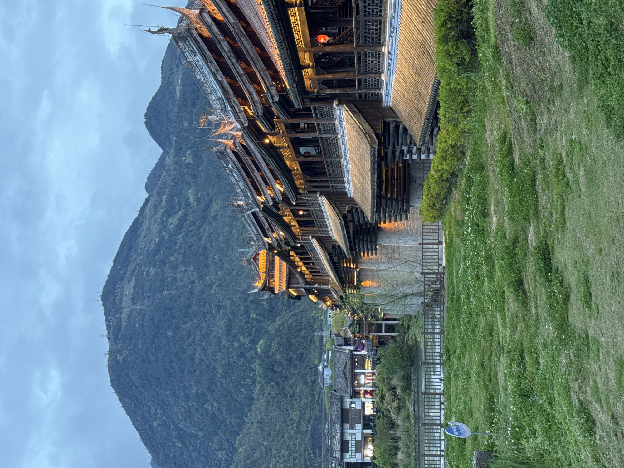 A daytime shot depicts an eye-level view of an elaborate, multi-tiered wooden building, likely a traditional Chinese architectural style. The building, illuminated with warm lights, has intricate detailing along its roofline and facade, with tiled roofs and exposed wooden beams. The building is on the right. A mountain occupies the upper left, its surface covered in dense vegetation and partially obscured by a cloudy sky. The sky is gray and overcast. A portion of a green field is visible in the bottom right. In the bottom center are other buildings and some fencing, indicating the presence of human development in the immediate area. The Zhuoshui River is running in the center of the photo, with buildings and a town on its banks.
