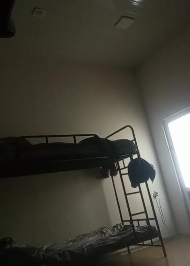 inside of a dimly lit room with a bunk bed on the left side and a bright window to the right. The bunk bed is made of metal, and the beds appear to have gray bedding. A dark jacket hangs on the ladder of the bunk bed. The camera moves around the room, eventually focusing on the underside of the top bunk. The walls are painted in a light color. The ceiling is white and has two square light fixtures. The floor appears to be made of wood.