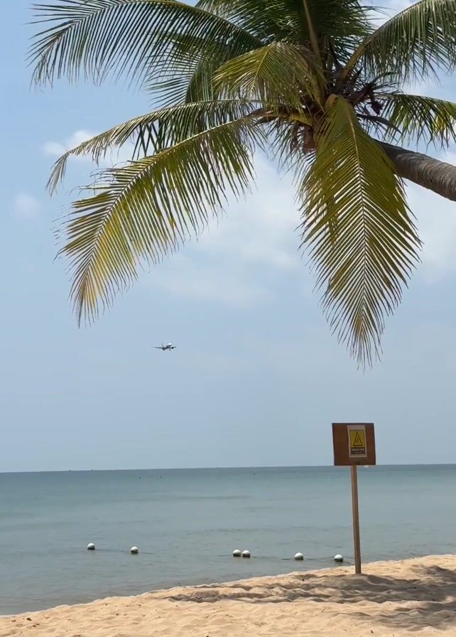 The scene captures an idyllic beach vista. Dominating the foreground is a tall, verdant palm tree leaning slightly into the frame, its fronds swaying gently. The beach itself is composed of soft, golden sand. Beyond the beach lies a calm, blue sea, speckled with white buoys. An airplane is visible in the distance, descending from a clear blue sky with scattered white clouds. A brown, rectangular warning sign is embedded in the sand, its message unclear. The scene conveys a tranquil atmosphere.