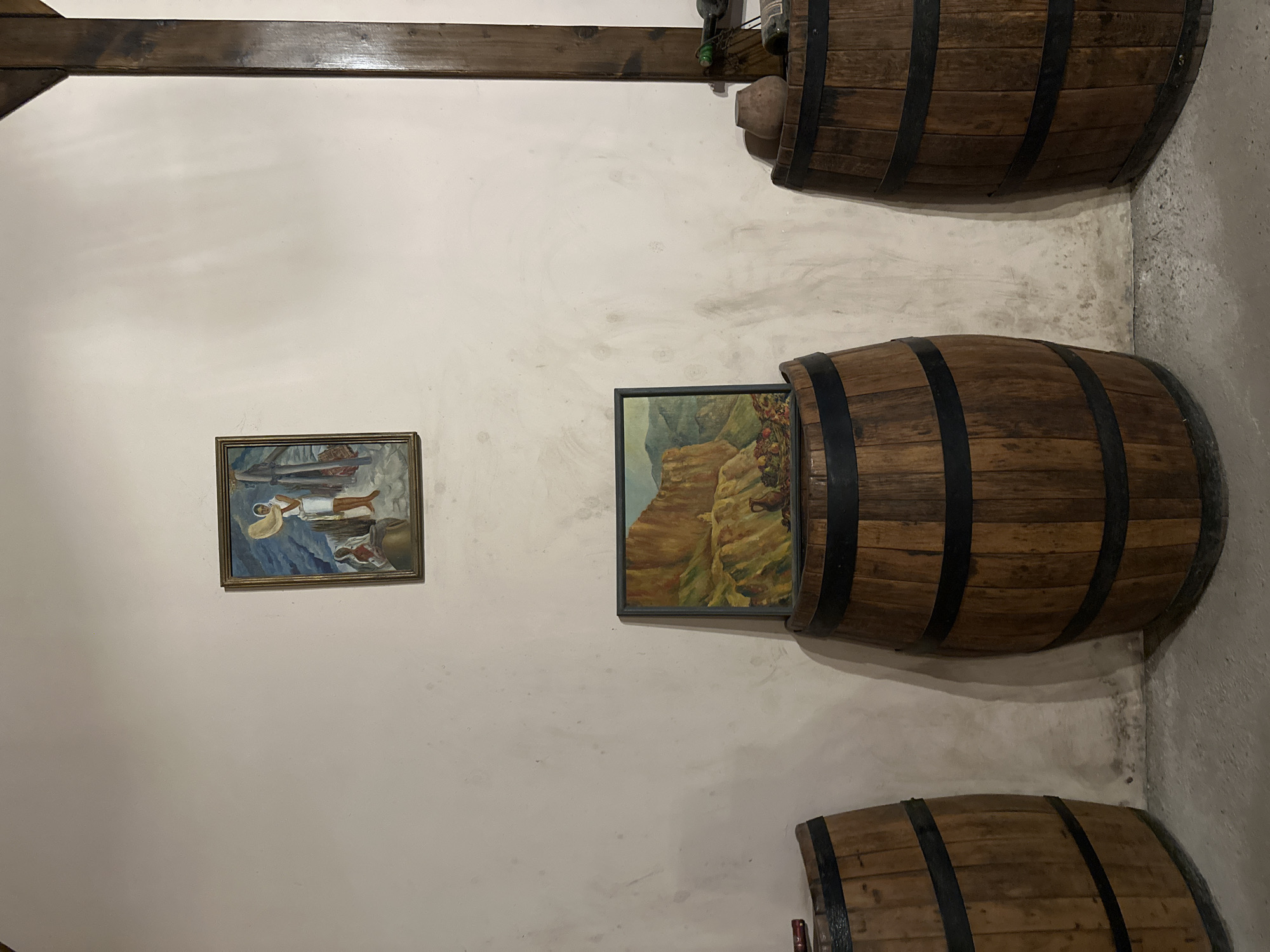 The image displays an interior room in Areni, Armenia, characterized by a light-colored, scuffed concrete wall and a grey concrete floor. Three large, dark-stained wooden barrels with black metal bands are arranged along the wall. The leftmost barrel is partially visible on the bottom left. A central barrel supports a framed landscape painting depicting rugged, reddish-brown rock formations, green foliage, and a blue sky, with a dark jug and grapes in the foreground. Above this, a smaller framed painting hangs on the wall, showing two figures in a traditional setting: one standing figure holding a light-colored flatbread, and another seated figure. A prominent, dark wooden structural beam is vertically positioned against the wall on the right side of the frame. On the top surface of the rightmost barrel, a small, light-brown unglazed pottery vessel and a dark green bottle are visible, along with a portion of a wine bottle rack.