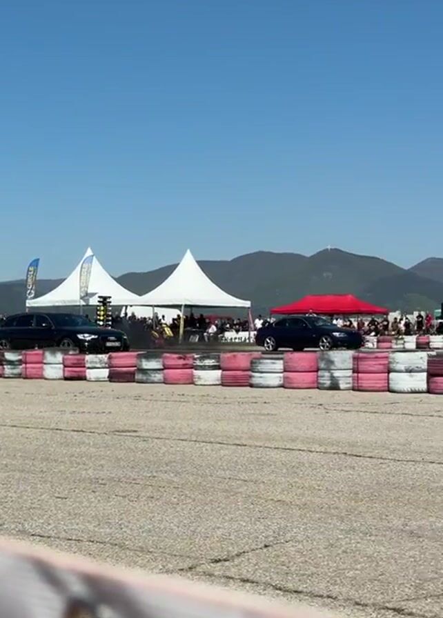 car racing event. There are two cars, a black Audi station wagon and a dark blue hatchback, lined up at the starting line. Behind them, there is a crowd of people standing in front of several white tents and blue flags. The race track is bordered by a row of tires painted white and pink. In the background, mountains can be seen under a clear, blue sky. After the cars race down the track, a black Seat Ibiza is seen driving in front of the camera. It has silver rims, a sticker on the windshield, and an exposed intercooler.