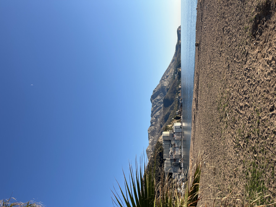 The image depicts a wide-angle view of a sandy beach and coastline in Rafailovići, Montenegro, under a clear, bright blue sky. In the foreground, a light brown sandy beach occupies the lower third, marked with numerous footprints and sparse patches of green vegetation. A large green palm frond is visible on the extreme left, partially framing the scene. The midground features calm, blue-green sea water, extending from the beach towards the horizon. A small, dark, indistinct object rests on the sand near the water's edge on the right. In the background, along the coastline, a dense cluster of multi-story buildings with light-colored facades is visible, situated at the base of a large, rugged mountain range. The mountains, characterized by rocky terrain and some scattered green vegetation, dominate the distant background, sloping downwards towards a distant headland on the right. A faint white crescent moon is visible in the upper right quadrant of the sky. No individuals are present within the frame. The scene is illuminated by natural daylight, casting shadows consistent with a mid-morning or afternoon sun angle.