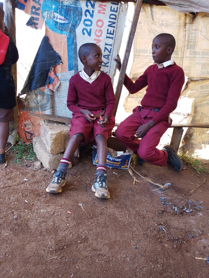 - "Two boys in maroon sweaters and shorts sit outside a makeshift structure" by FM-iEg4i1, licensed under CC BY 4.0