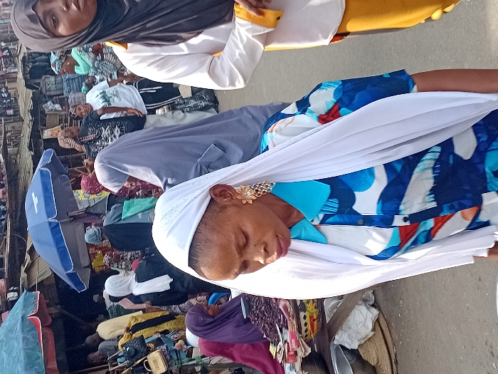 The image captures a bustling outdoor market scene. Several people are present, many wearing head coverings, including hijabs or white veils. Merchandise is visible throughout the scene, suggesting a marketplace atmosphere. One woman in a blue and white shirt with a white veil is positioned prominently in the foreground. Another woman in a gray hijab and a white and yellow top stands towards the top. An umbrella provides shade.