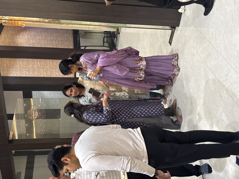 Several people are gathered indoors, standing and looking down at something. One woman in a lavender, intricately embroidered outfit holds a phone. Another woman beside her is holding a cell phone, too. Another person is wearing a blue patterned tunic and grey pants. In the foreground, a person in a white shirt and black pants faces away from the camera. The room appears to be a banquet hall or event space with modern decor.