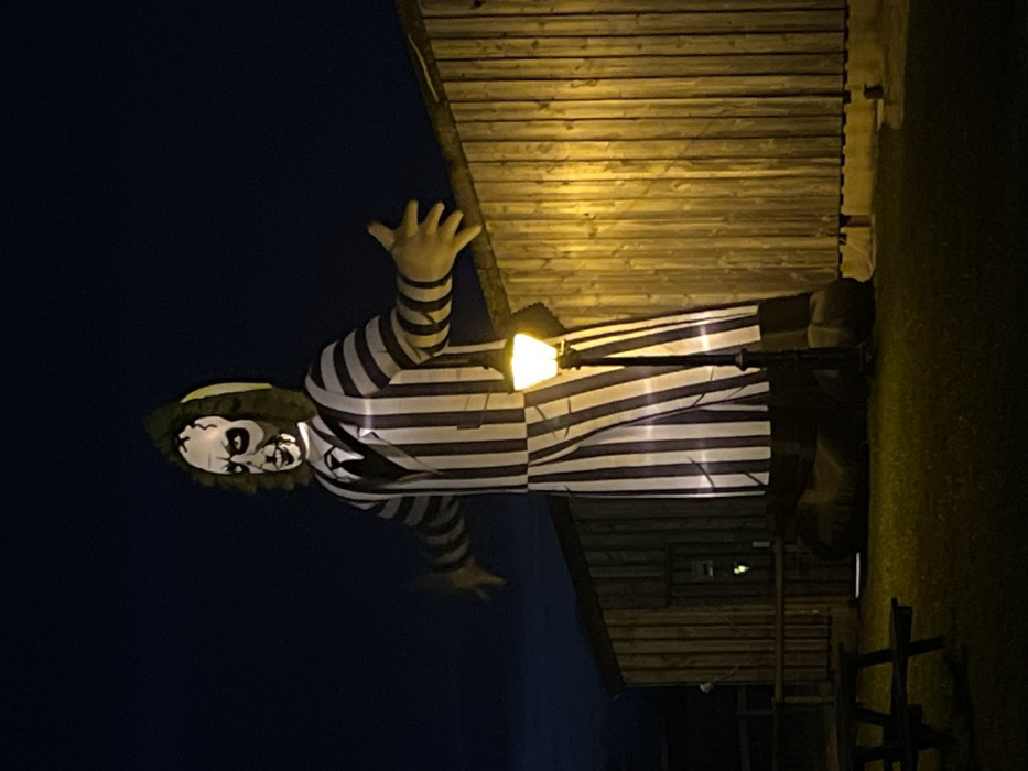 The image depicts an outdoor night scene in the city of Swyre, United Kingdom. A large, internally illuminated inflatable figure, resembling the character Beetlejuice, stands centrally. It wears a black and white vertically striped suit with a dark tie, possesses a pale face with dark eye makeup, and green disheveled hair. Its arms are outstretched horizontally. In front of the figure and slightly to its right is a black, ornate lamppost emitting a warm yellow light, illuminating the inflatable and a light-brown vertical wooden plank structure directly behind it. The ground in the foreground is dark green grass. A dark wooden picnic table with attached benches is partially visible in the lower-left corner. The background is a dark night sky. No human subjects are present.
