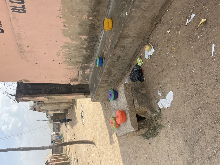 The image depicts a dusty, unpaved street scene in Dabawa, Nigeria, under a partly cloudy sky. In the immediate foreground, the ground is bare earth heavily littered with various debris, including white paper scraps, plastic wrappers, a black plastic bag, and organic material such as fruit peelings and a whole light-colored fruit. To the left, a rough concrete pedestal holds two brightly colored lidded plastic bowls: one orange and one green. To the right, a long, low concrete bench extends from a building. On this bench, three additional brightly colored lidded plastic bowls are positioned: one purple, one blue, and one yellow. The building on the right features a faded peach or pink stucco exterior with significant dark staining and discoloration extending upwards from its base. Black block letters, partially visible as "BLOC", are painted near the top right corner of this wall. A dark, ornate metal door with a spiral design is set into the building's wall, topped by a section of barbed wire coiled along the building's perimeter. A slender, light-colored wooden pole stands vertically in the left mid-ground. Further down the street in the distance, a single individual, wearing a blue garment and carrying an item on their left shoulder, walks away from the viewer along the unpaved path. Other rudimentary buildings and structures line the street in the background, with overhead utility wires visible.