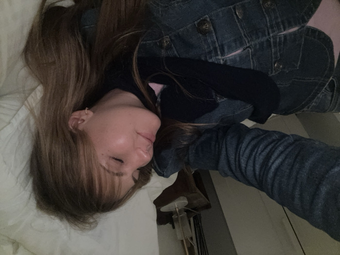 A woman with long, light brown hair lies on a white pillow. She is wearing a denim jacket and a long-sleeved dark shirt. Her eyes are closed and she appears to be resting. A bedside lamp and table are partially visible in the background, suggesting an indoor setting. The image is taken from a high angle.