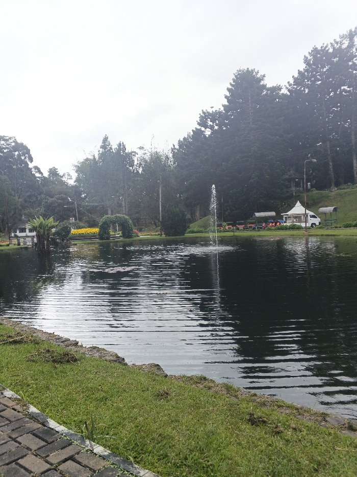 This image displays an outdoor park or recreational area in Matopos, Zimbabwe, under a bright, overcast sky. The foreground features a paved pathway composed of rectangular grey and brown pavers, adjacent to a strip of mowed green grass bordering a dark, rippled body of water. A water fountain is active in the center-right of the water, projecting a vertical stream. Across the water, from left to right, a partially obscured white building with a dark roof is visible among trees. A landscaped garden includes a large green arched trellis and a yellow flower bed. On the far bank, a white vendor tent with a conical roof stands next to a white van. Multiple open-sided shelters with dark roofs are situated on a grassy slope, accompanied by colorful objects resembling small recreational boats. A tall streetlamp is also present. The background consists of a dense forest of tall, dark green coniferous trees covering a rising hillside. No individuals or specific actions are visible.