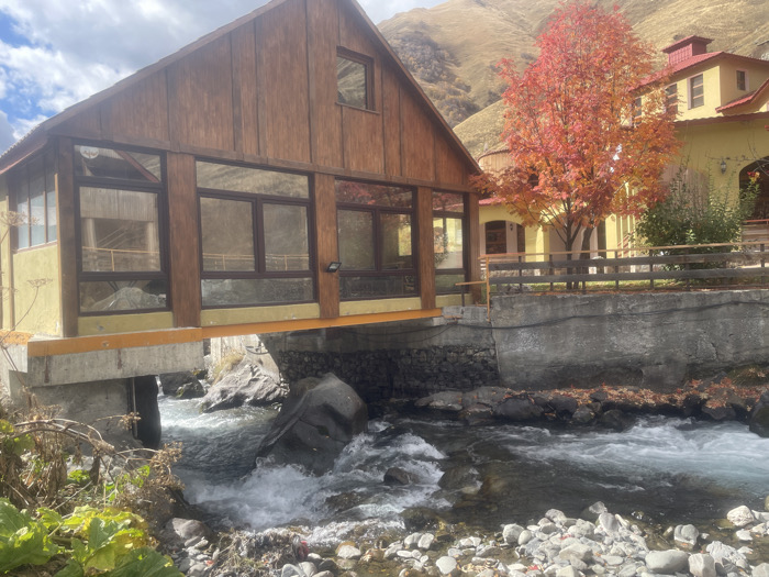The image depicts a mountainous autumn scene in Juta, Georgia. In the foreground, a rapidly flowing river with visible white rapids and rock formations occupies the lower half of the frame, flowing from right to left under a cantilevered building. To the left, a two-story structure with a brown wooden gabled roof and vertical wooden siding on the upper story extends into the frame. The lower story features pale yellow stucco walls and large, dark-framed windows forming a glass-enclosed space, which is supported by an orange structural beam and concrete piers extending into the river. To the right, a second building with pale yellow stucco walls and a red tile roof is partially visible, featuring arched openings. Between these two structures, a deciduous tree with vibrant red-orange autumn foliage stands prominently. A low wooden fence runs along the top of a concrete retaining wall that borders the riverbank, separating it from the yellow-walled building and the red-leafed tree. The background consists of steep, treeless, light brown mountains under a partly cloudy blue sky. No individuals or animals are visible in the scene.