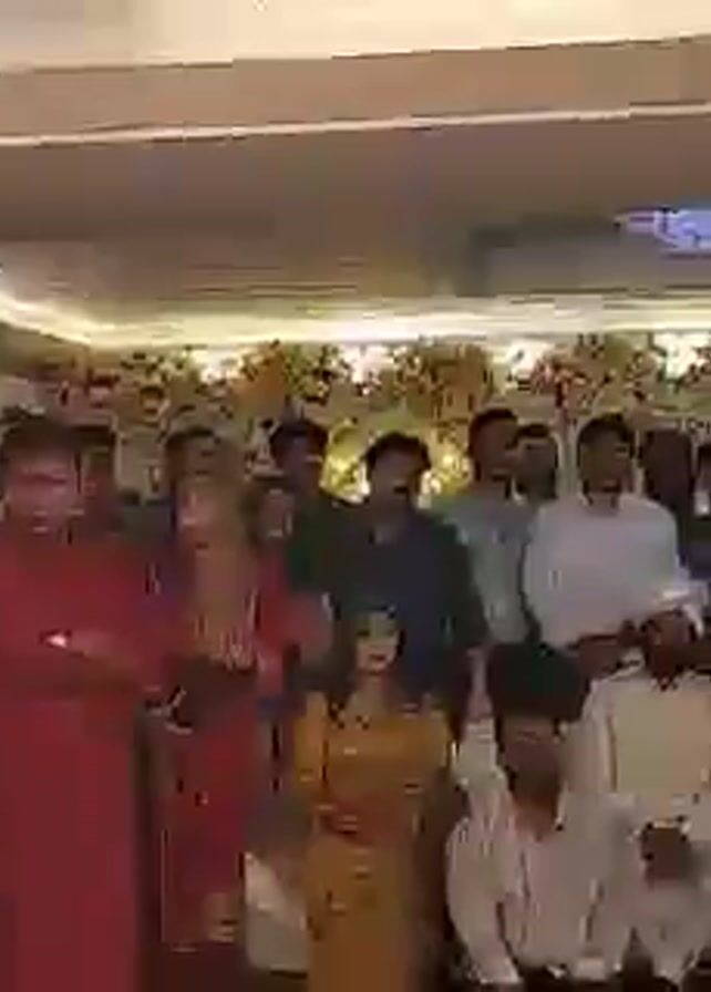 A group of approximately 20 people poses for a group photo indoors. A bride in a red hijab stands center-left. A groom is seated to her left. The group appears to be at a wedding or celebratory event, indicated by the floral decorations in the background. Most of the men are dressed in casual or semi-formal attire. A security camera is visible in the upper left corner. The lighting is bright and even, suggesting a modern indoor venue.
