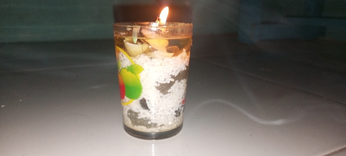 A glass container rests on a white tile surface. Inside the glass, layers of white rice and dark material are visible. The glass is filled with clear liquid, possibly oil, and topped with small white objects floating near the surface. A small, bright flame burns atop the liquid, acting as a makeshift candle. The glass features a vibrant image of a fruit, possibly a mango, adding color to the scene.