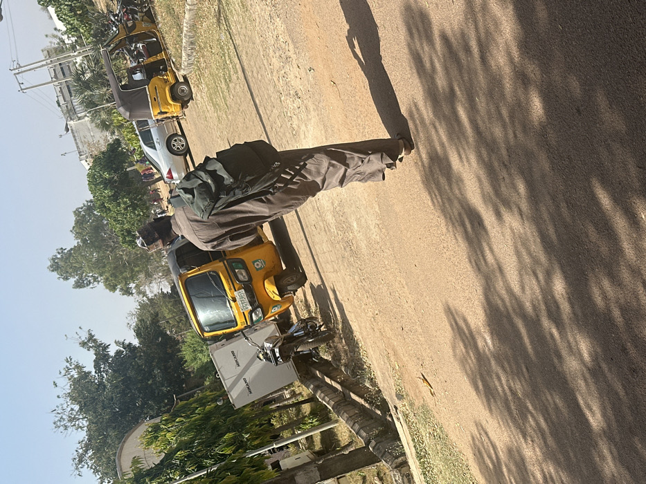 An outdoor scene in Tudun Nupawa, Nigeria, depicts a daytime environment with clear skies and strong sunlight casting long shadows. In the foreground, a lone individual, seen from behind, walks away from the viewer on a dirt road. This person wears a brown, loose-fitting garment, a cap, and carries a dark green backpack on their left shoulder. Their shadow extends prominently on the reddish-brown ground. To the left of the road, a concrete drainage channel runs parallel. Adjacent to this channel and further down the road, a black motorcycle is parked next to a large white rectangular object with "MIKANO" branding visible on its side. Immediately to the right of this object and the motorcycle, a yellow three-wheeled vehicle (tricycle/Keke Napep) with a black canopy is parked, facing slightly left. A license plate, partially visible as "PGZ-651," is affixed to its front. Further in the background, another yellow tricycle is visible on the right side of the road, and a silver sedan is parked between the two tricycles. Trees and green foliage line both sides of the road, with some denser trees in the mid-ground and lighter green, thinner trees closer to the foreground on the left. Structures are faintly visible in the far background. The ground is primarily unpaved, appearing as compacted dirt or sand.