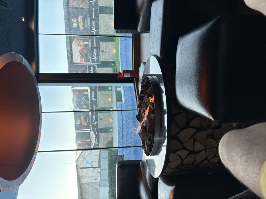 The image depicts an indoor lounge setting, likely within a Pulse Fitness and Spa complex in Sofia, Bulgaria, overlooking an outdoor pool area. From a first-person perspective, a segment of a bare human leg (thigh and knee) is visible in the immediate foreground. The interior features dark leather armchairs and square ottomans surrounding a central round table. The table's base is constructed from stacked, cut log sections, and its black top incorporates a circular, recessed fire pit containing glowing, irregular rock-like elements with visible orange flames. A red fire extinguisher stands upright near the dark frame of a large window. A large, circular, dark-rimmed overhead light fixture with a rust-colored interior partially intrudes into the upper frame. Beyond the expansive windows, an outdoor swimming pool with light blue mosaic tiling is visible. Behind the pool, a series of large advertising banners feature "Nuii" ice cream products and prominent "Pulse" branding, including a stylized heartbeat logo and hashtags such as #PULSE and #BEACTIVE. Further in the background, a light-colored, possibly industrial structure or building wall is visible under a clear, bright sky.
