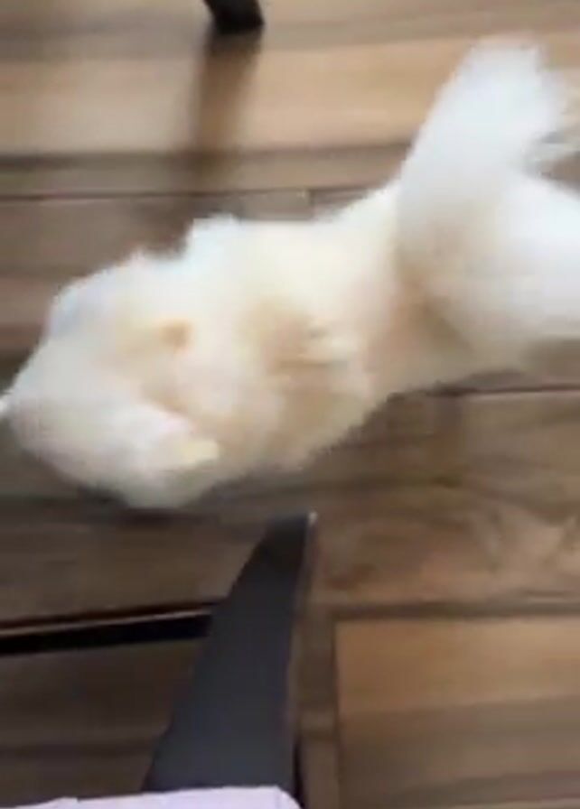 A close-up video shows a small, fluffy white dog on a wooden floor