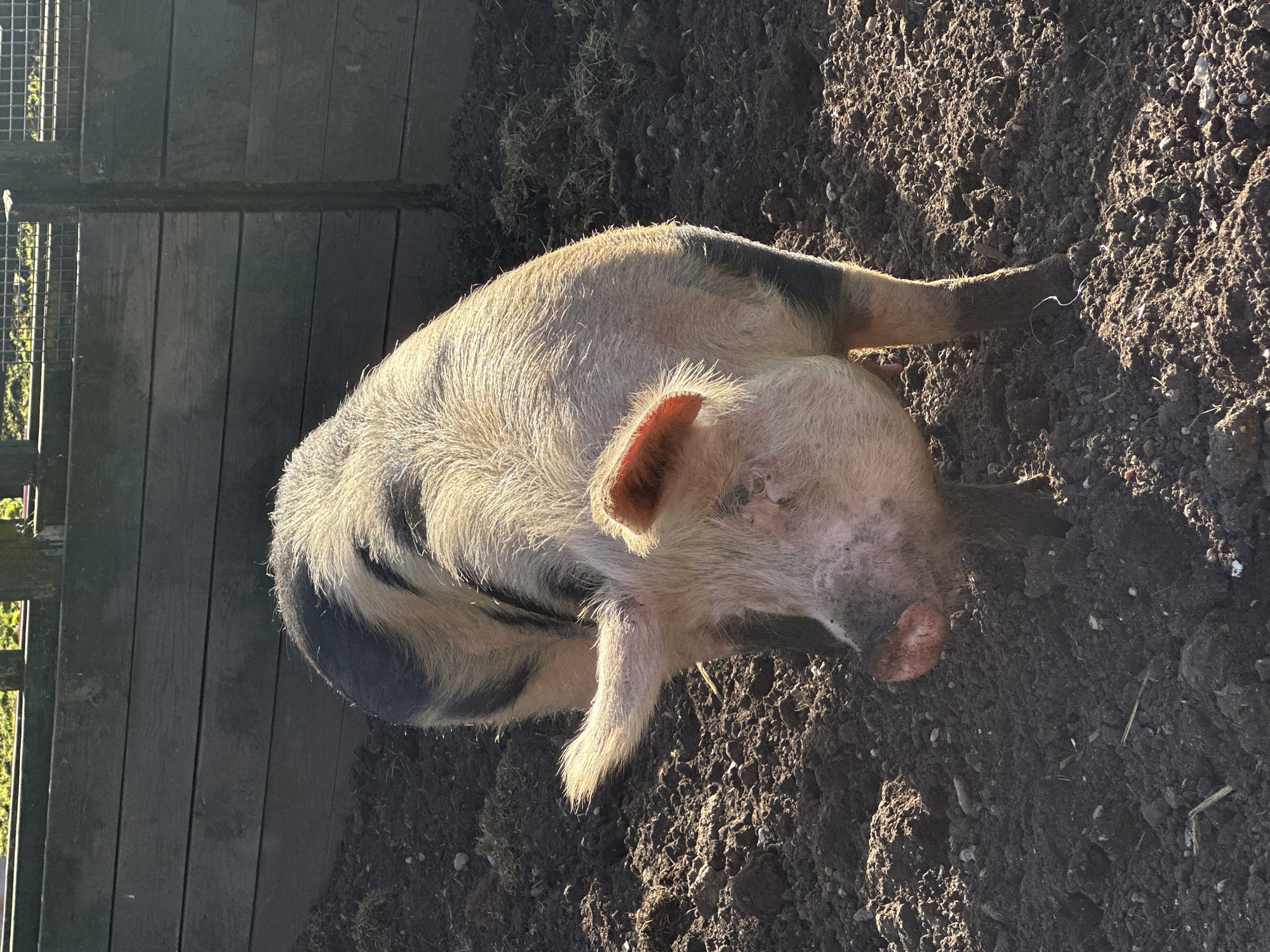 - "A pig lies on the ground next to a wooden fence" by FM-hLwGm2, licensed under CC BY 4.0