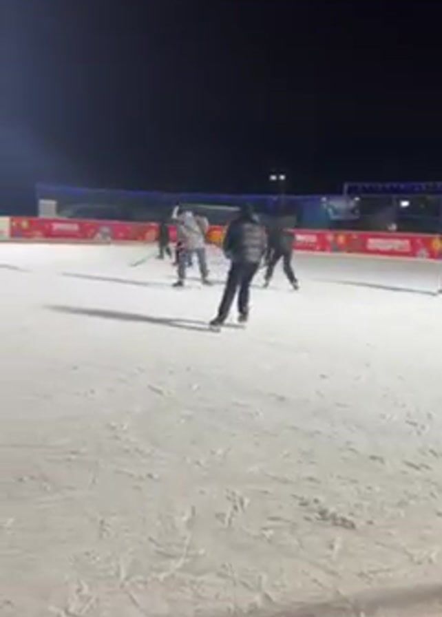n outdoor ice rink at night with several people playing hockey. They are dressed in winter clothing and using hockey sticks to maneuver a puck on the ice. The rink is illuminated by bright overhead lights, and there's a decorative border around the perimeter of the ice surface. The ice appears well-maintained, and the players are actively engaged in the game.