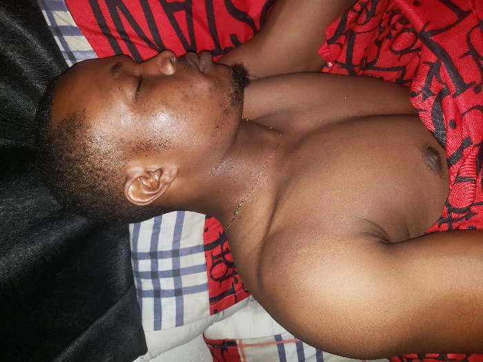 A male individual with dark skin, short dark hair, and facial stubble is depicted sleeping or resting in an indoor setting. The subject is lying on their right side with closed eyes, facing right from the viewer's perspective. A thin gold-colored chain is worn around the neck. The upper torso and right arm are bare. A red blanket featuring a black repeating geometric or abstract pattern covers the lower chest and body. The individual's head rests on a pillow with a blue and white plaid pattern. A dark, solid-colored surface, possibly fabric, is visible behind the pillow. The scene is located in Okpanam, Nigeria.