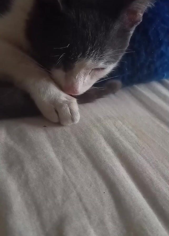 - "A kitten, primarily white with dark gray markings on its head, rests on a light-colored striped surface, possibly a bed or cushion" by FM-DhFfC2, licensed under CC BY 4.0