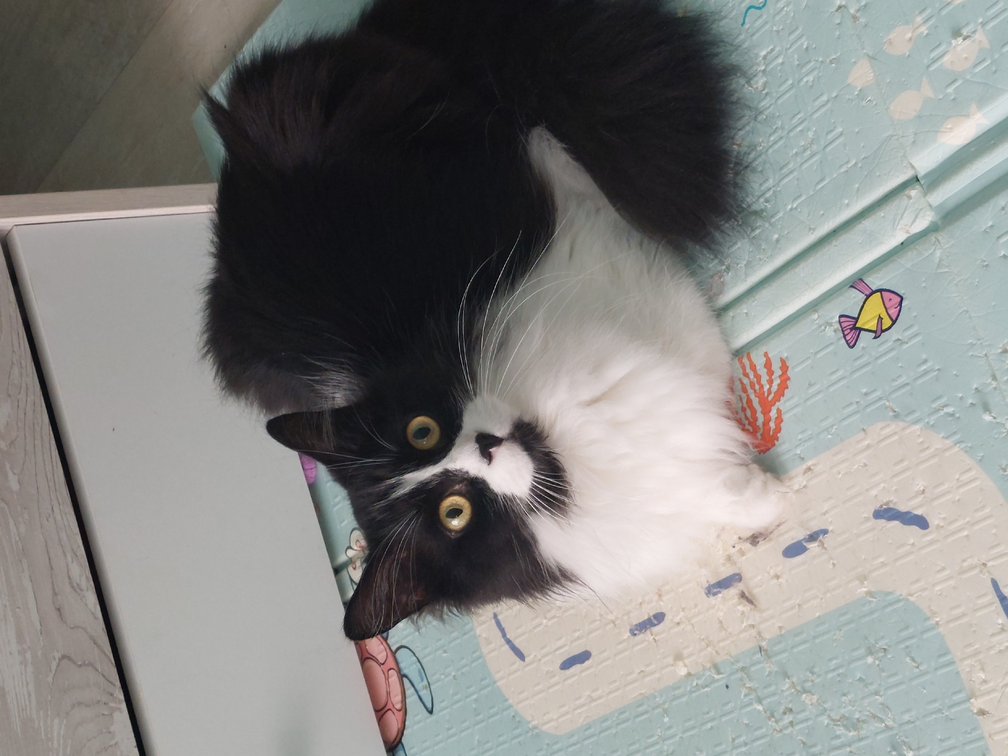 - "A black and white, medium-haired domestic cat with prominent yellow eyes and white whiskers is depicted lying prone on a light blue and white foam play mat" by FM-sWaGl1, licensed under CC BY 4.0
