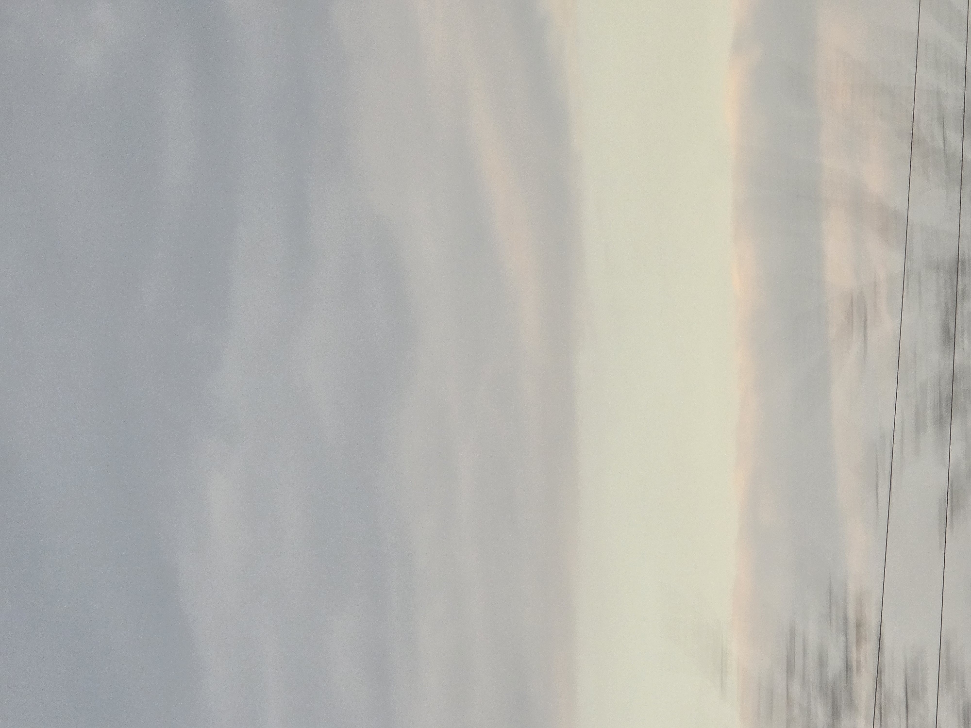 The image depicts an outdoor scene dominated by a layered sky, observed from a moving perspective within or near Arnautito, Bulgaria. The upper portion of the frame features diffuse gray and light blue-gray clouds. Below this, a horizontal band of pale yellow-cream light extends across the middle. The lower part of the sky exhibits a soft band of pinkish-orange hues, suggesting ambient light at either dawn or dusk. In the bottom quarter of the frame, two prominent dark, horizontal lines are visible, consistent with utility wires. Beneath these wires, and extending to the very bottom, are heavily motion-blurred, indistinct organic shapes, indicative of tree branches or vegetation, blurred due to horizontal camera movement. No people, specific structures (other than the wires), or distinct subjects are present.