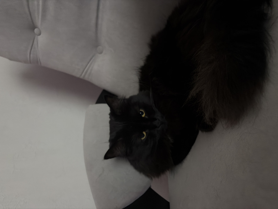 - "An indoor scene in Rostov-on-Don, Russia, depicts a black, long-haired domestic cat resting on a light-colored, possibly grey, upholstered armchair or sofa" by FM-fHMy02, licensed under CC BY 4.0