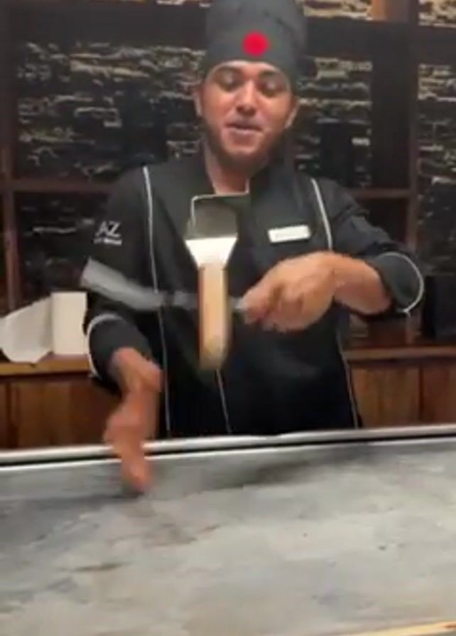 A chef with a black chef's hat and black uniform stands behind a metal tepanyaki griddle. He is juggling the metal spatula between his hands. He has a red circle on the top of his hat. He smiles at the camera and holds up one finger. The background is a wood paneled wall and shelves. A roll of paper towels sits to the left.