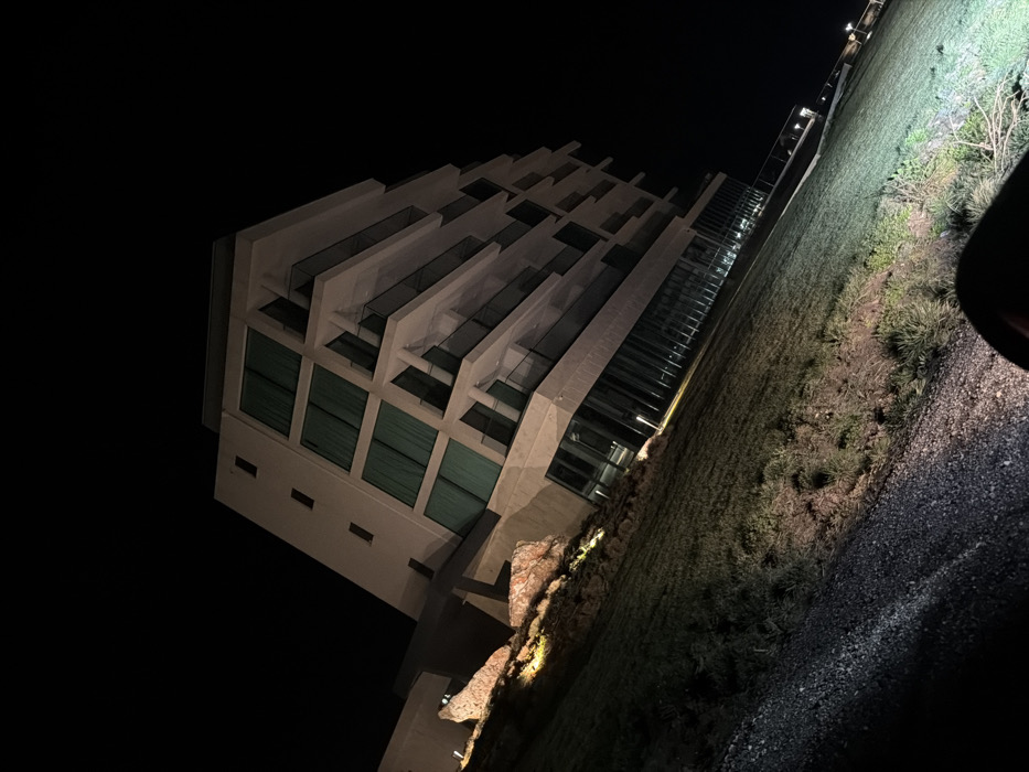 The image displays a modern, multi-story building with a light-colored, angular facade situated at night in Kavarna, Bulgaria. The structure features multiple levels with recessed balconies equipped with glass railings. Numerous large rectangular windows are visible, many exhibiting drawn teal-green interior blinds or curtains. The ground floor presents extensive glass paneling. The immediate foreground consists of a gravel path on the left, transitioning into an uneven grassy area, which is illuminated by a bright, directional light source originating from the lower right of the frame. Adjacent to the building's base on the left, a landscaped section contains large reddish-brown rocks, highlighted by ground-level spotlights. The sky above is dark and featureless. No individuals or specific activities are observable within the scene.