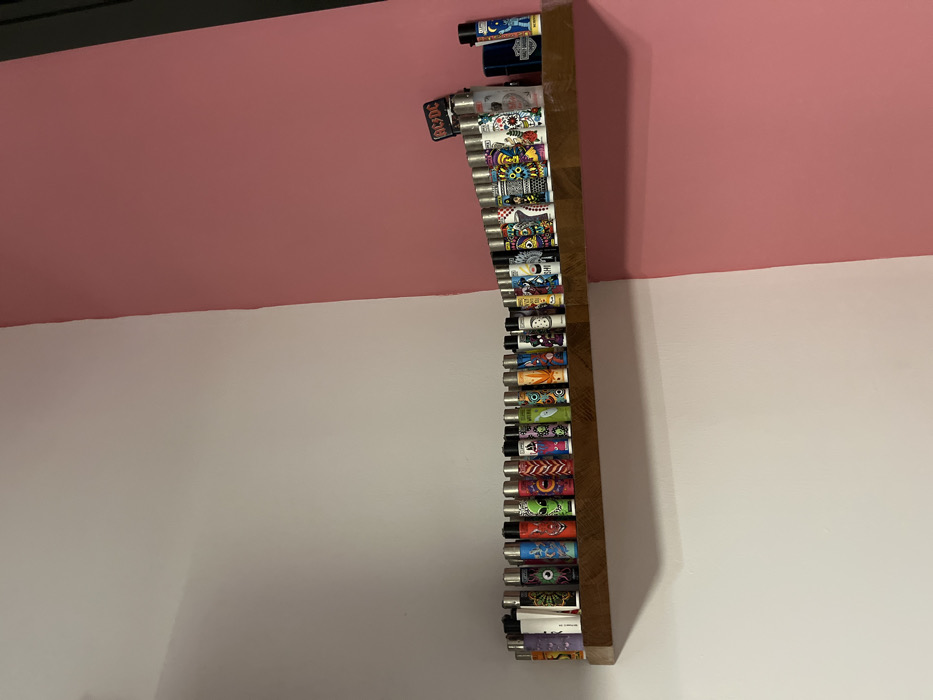 The scene depicts an interior room in Ramat Gan, Israel. A collection of approximately 40-45 various Clipper lighters is neatly arranged on a dark, horizontal wooden shelf. The lighters exhibit diverse graphic designs, including cartoons, alien figures, abstract patterns, and brand logos such as "ACDC" and "Harley Davidson." The shelf is mounted against a wall that is painted off-white on the left side, transitions at an interior vertical corner, and continues along an adjacent wall painted solid pink on the right side. No individuals are present, and no active interactions are depicted.