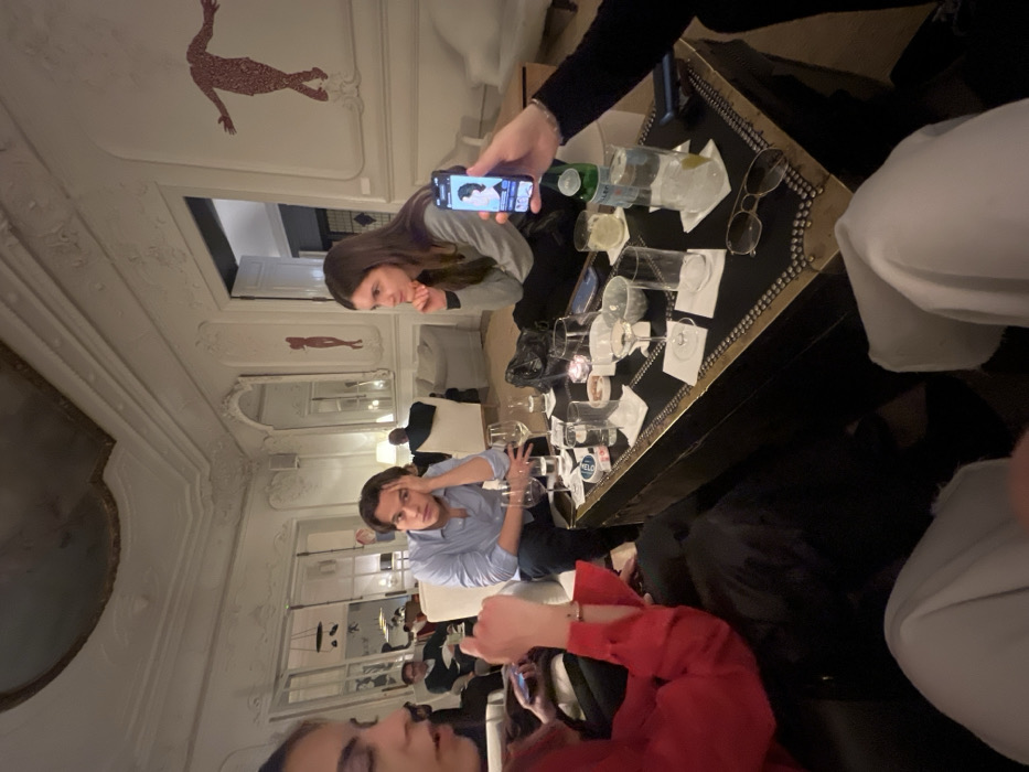A rotated interior scene shows a group around a black and gold coffee table littered with empty glasses and napkins