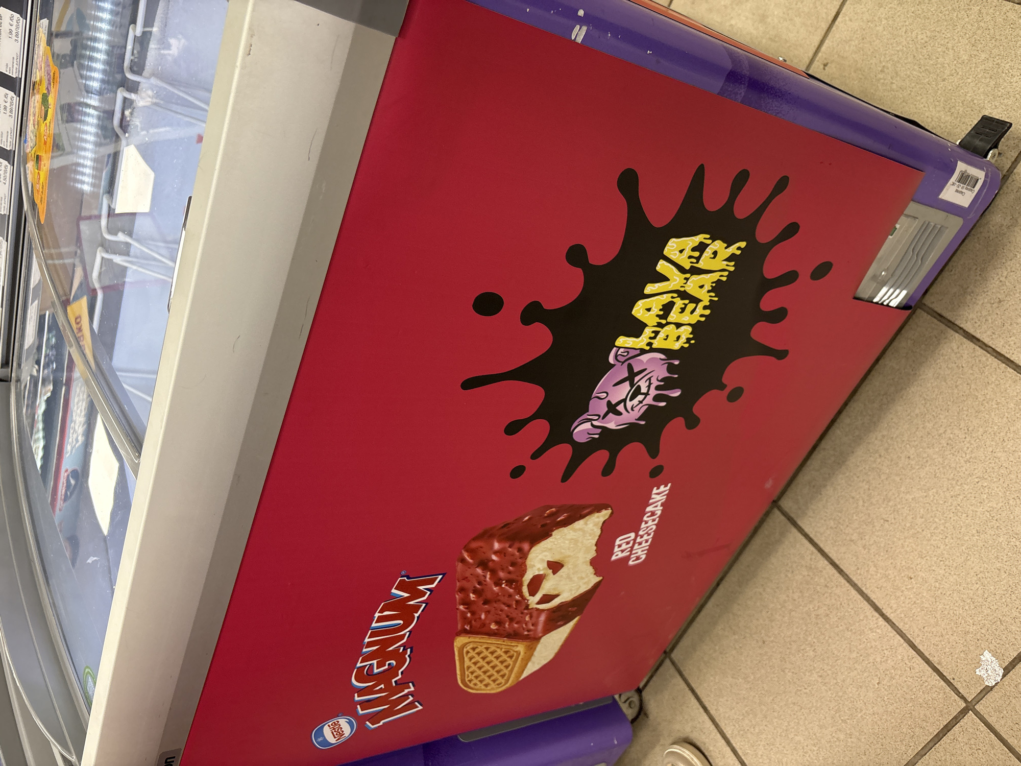 close-up of a freezer display case, likely in a retail setting in Veliko Tarnovo, Bulgaria, judging from the Cyrillic price notation "ЛВ/бр". The freezer has a red advertisement panel for Magnum Red Cheesecake ice cream. The panel features the Magnum brand name, an image of the ice cream bar, and stylized graphic elements including a black splatter design and text in a stylized font. The freezer itself appears to be well-lit internally, with various products visible inside. The floor is tiled in a neutral color.