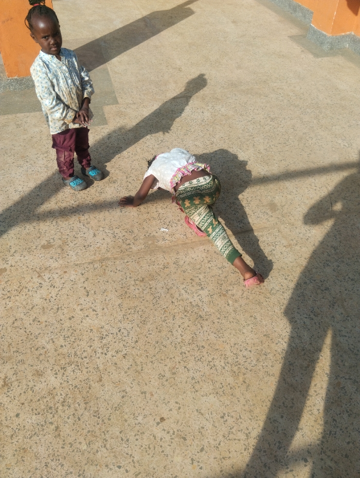 The image depicts an outdoor scene in Witeithie ward, Kenya, featuring two young children on a light-colored, speckled concrete surface under direct sunlight, casting prominent shadows. In the upper left portion of the frame, a child stands upright, facing the viewer. This child has dark hair styled in small braids or knots on top of their head. They wear a light-colored, patterned long-sleeved shirt, dark red or maroon trousers, and blue closed-toe shoes. Their hands are clasped in front of them, and their expression is neutral or slightly serious. The standing child's shadow is visible extending to their right. In the mid-ground, to the right of the standing child, a second child is positioned face-down on the concrete surface. This child is supported on their hands and forearms, with their back arched. They wear a light-colored top with a ruffled hem and green patterned trousers with a white and black geometric design. Pink footwear, possibly sandals, is visible on their feet. Their head is turned away from the camera, looking towards the ground. An orange-painted wall with a dark gray base is visible along the left edge and in the upper left corner of the background, indicating a building structure. Multiple long, dark shadows from unseen figures or objects are cast across the concrete surface, suggesting bright daylight conditions. The concrete appears dry and clean.