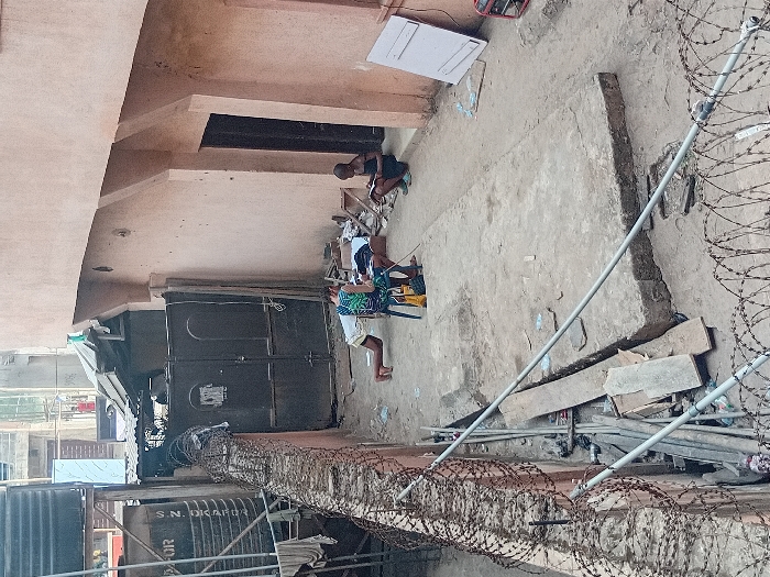 The scene depicts an outdoor urban alleyway or courtyard in Unknown, Chad, enclosed by structures. To the left, a approximately 1.5-meter-high reddish-brown wall is topped with multiple coils of rusty razor wire, with metal conduits running horizontally below it. Behind this wall, a large black cylindrical water tank, marked "SINFOR," is visible. Further back, a dark metal double gate stands partially open, revealing a structure with a corrugated metal roof. To the right, a two-story building with light-tan stucco walls features multiple vertical concrete buttresses and a dark, recessed doorway on the ground level. A white rectangular panel leans against the wall near the doorway, beside which a red, portable generator is positioned on the dirt ground. The central ground area consists of compacted dirt and an elevated rectangular concrete slab. Various pieces of debris, including wooden planks, metal pipes, and refuse, are scattered across the dirt and within shallow trenches. Three individuals are present. In the center-left, an adult male in a green-patterned short-sleeved shirt and light shorts sits on a low blue and white plastic stool, focused on papers or objects on a surface in front of him. Behind this individual, a second adult male in a white t-shirt and light shorts is in a prone position, engaged in a push-up exercise. To the far right, near the building's doorway, a child with a closely shaved head, dressed in dark clothing, crouches on the ground, holding an open book or tablet. The scene is illuminated by daylight.