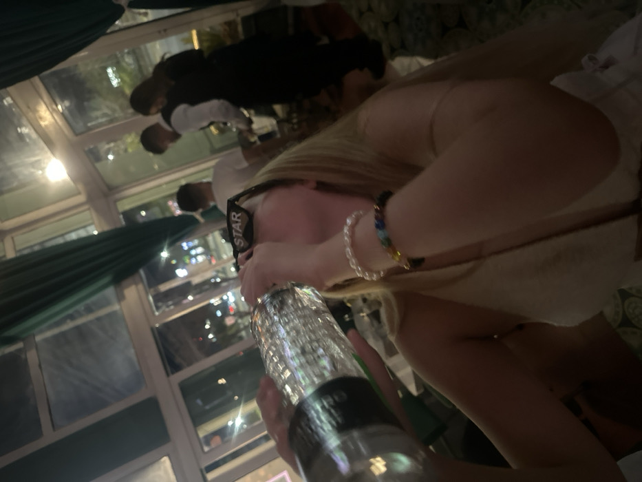 A person is drinking from a bottle with a sparkly, geometric design. The individual has blonde hair and is wearing bracelets. The person is also wearing glasses with the word "STAR" on the side. Background people are dressed formally. The setting appears to be a restaurant or bar, with views of a cityscape through the windows. A dark green curtain is also visible.