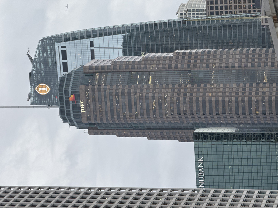 The image showcases modern architecture with a focus on tall buildings. The PwC logo is prominently displayed on one building, adjacent to another with a distinctive football emblem. Another building bears the name "NUBANK." The sky is overcast. A smaller bird is flying in the sky. The buildings' facades feature a mix of glass and structured patterns.