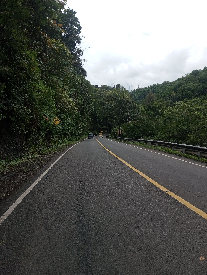 This image depicts a two-lane asphalt road winding through a densely vegetated mountainous landscape in Bangtsho, Bhutan, under an overcast sky