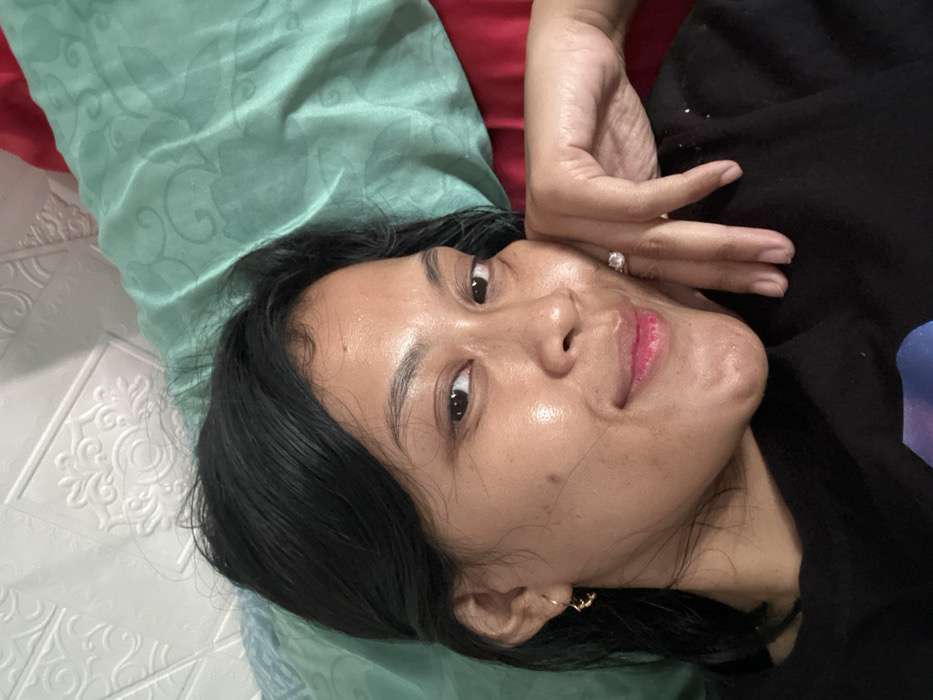 A woman lies on a green pillow with a red pillow behind it. She wears a black top. Her head rests against the pillow, and her right hand is near her face. She has dark hair and light skin. She gazes toward the viewer with a subtle smile. A ring is visible on her finger. The background also contains a textured white surface.