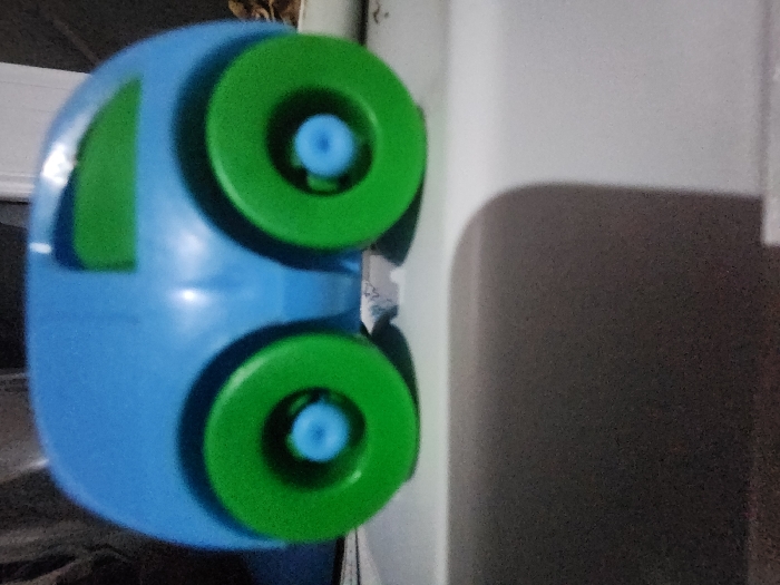 A blue toy car with green wheels and window is positioned near a white wall