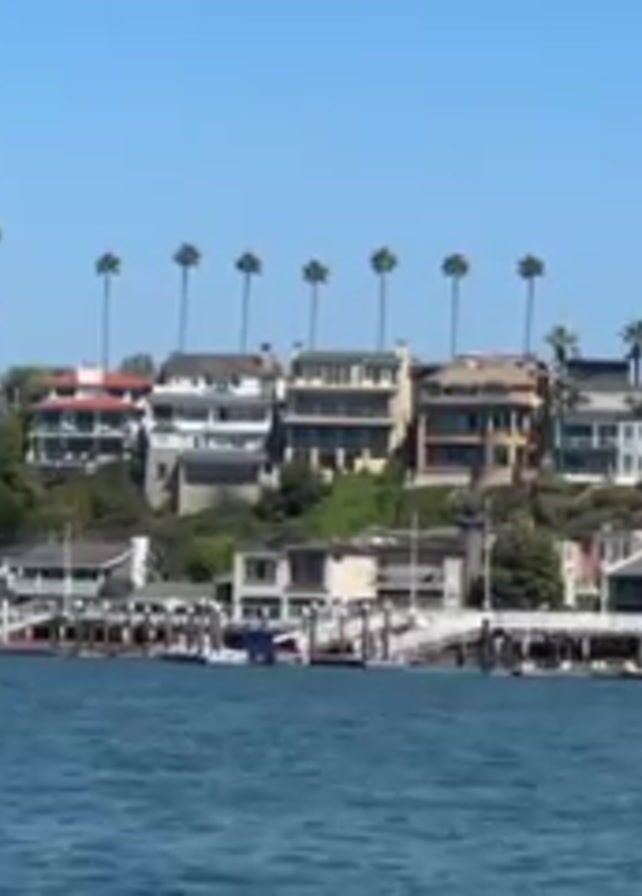 The camera captures a daytime view of waterfront homes. The houses, varying in size and architectural style, are situated on a sloping hill. Palm trees stand tall behind the houses, punctuating the skyline. Below the houses, there are several docks and piers extending into the water. Boats of varying sizes are docked alongside the piers. The water appears to be a deep blue color. The sky above is clear and bright blue. The scene appears to be stable with no visible movement except the slight lapping of the water.