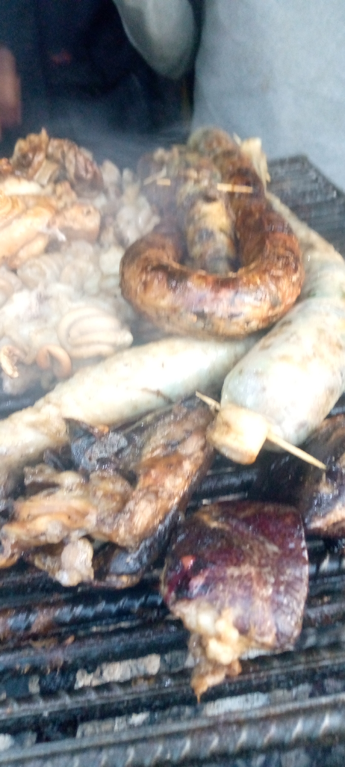 Grilled meat assortment features sausages, possibly chorizo and longaniza, and various cuts of meat