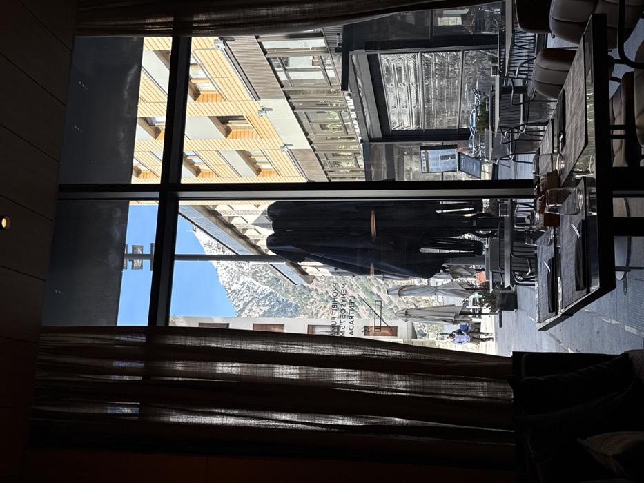 The image depicts an interior restaurant or café setting in Les Escaldes, Andorra, viewed through a large window overlooking a street scene and distant mountains