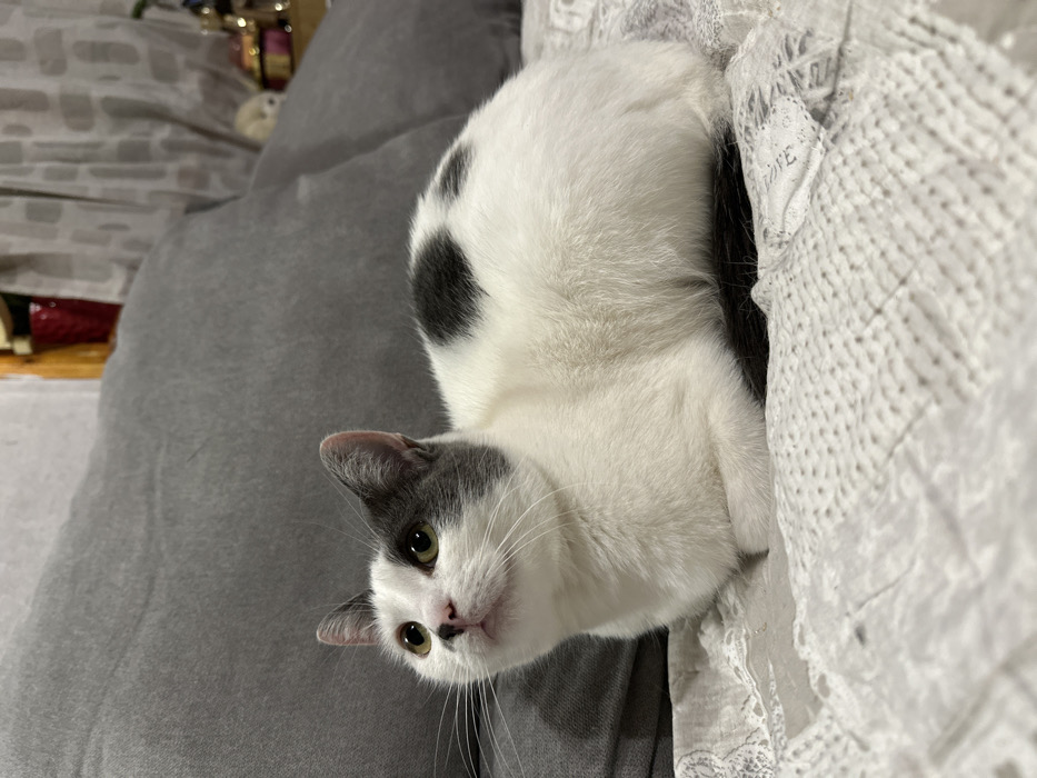 - "A white and grey bicolor domestic cat is seated on a light grey quilted blanket with a subtle patterned border, facing slightly to the left and looking upwards" by FM-U3eL23, licensed under CC BY 4.0