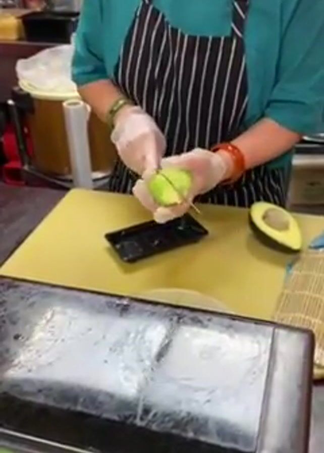 A person wearing a teal shirt, a black and white striped apron, and gloves is slicing an avocado on a yellow cutting board. They are using a knife to cut thin slices and place them into a small black tray. Half of an avocado is visible on the cutting board. Under the cutting board is a refrigerated display case. The background shows other kitchen equipment.