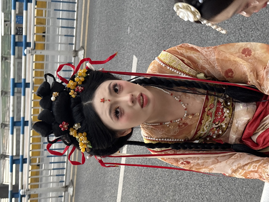 - "The image captures an outdoor urban scene in 江北城街道, China, featuring a young East Asian woman dressed in elaborate traditional Chinese attire" by FM-hd42B3, licensed under CC BY 4.0
